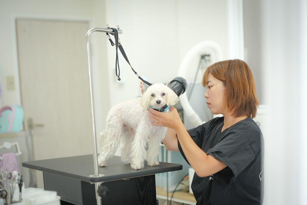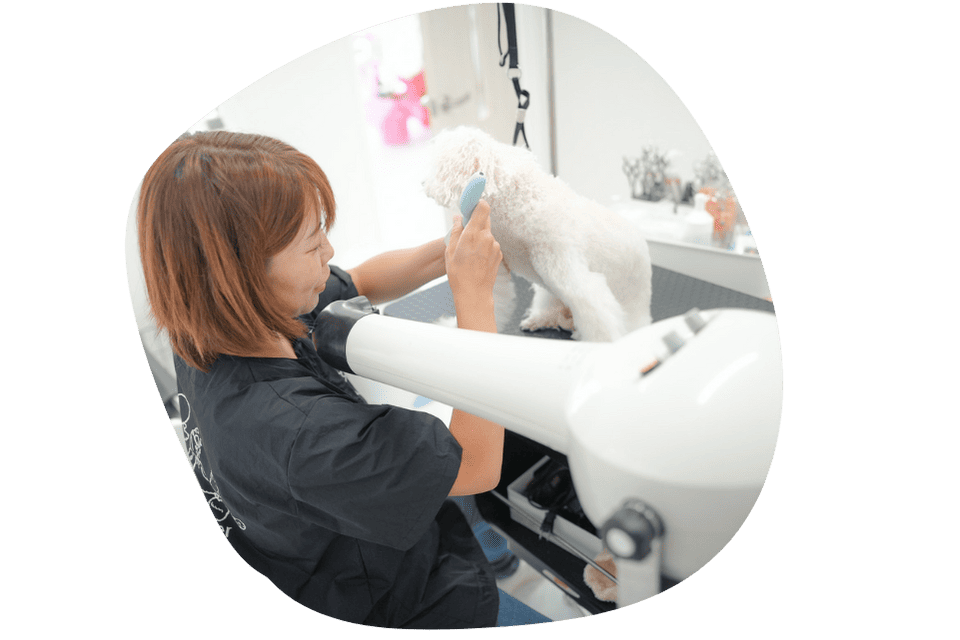 シャンプー犬種は復元ドライヤーで最後まで丁寧に乾かし、カット犬種はブロー後に復元ドライヤーの風をあてて仕上げます。