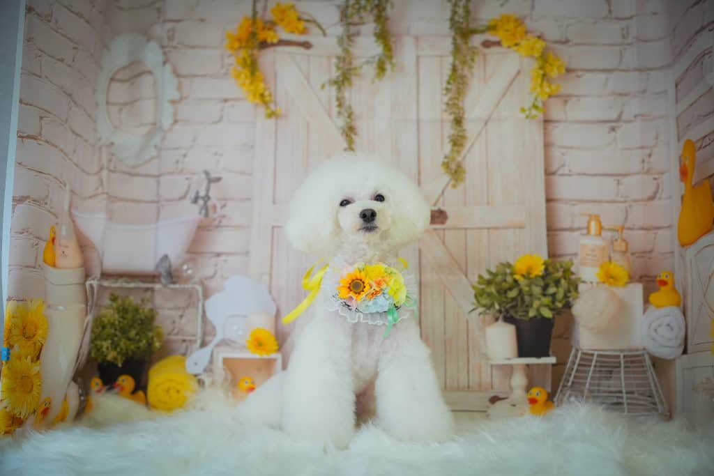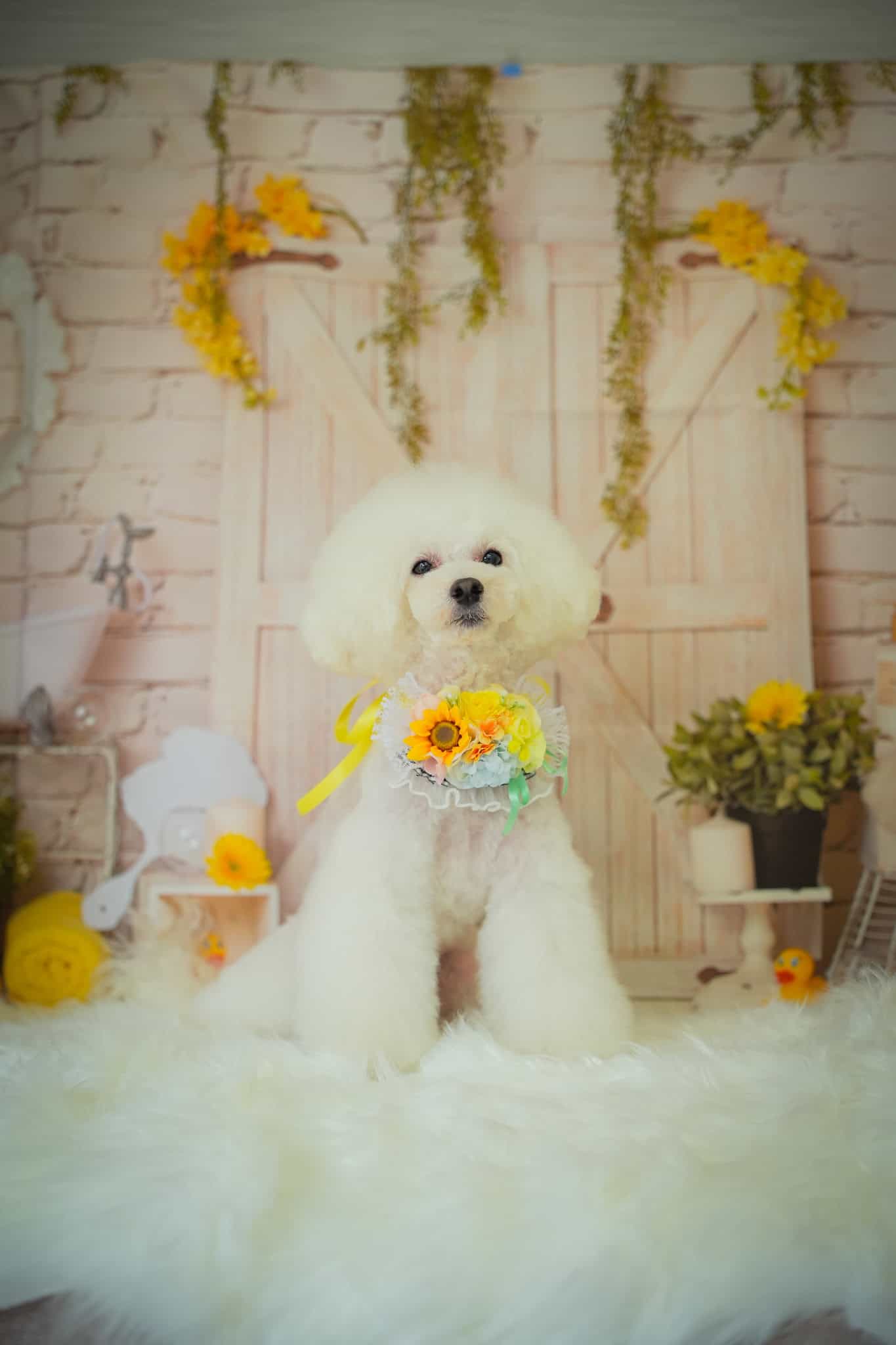 トリミング後の一番綺麗な状態のわんちゃんを、季節ごとに背景が変わる専用のフォトブースで、お家ではなかなか撮れない特別な一枚を撮影しています。